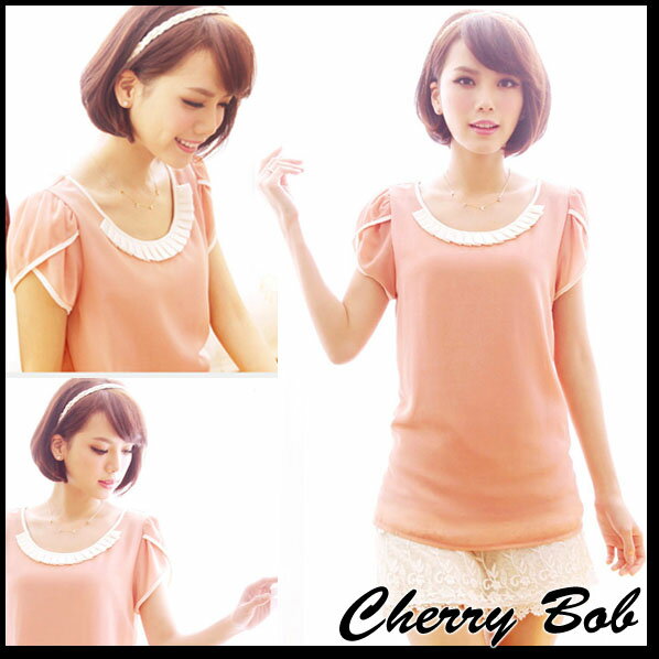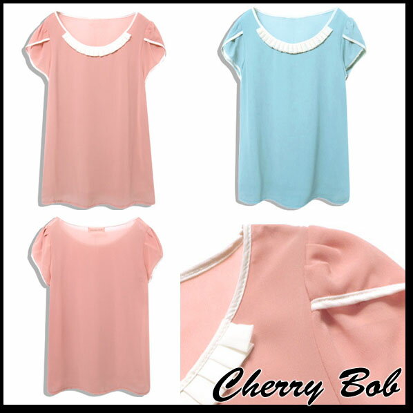 清楚感のあるパステル・シャーベットカラーのシフォンチュニックです! プリーツフリルの衿部分と袖のデザインがポイント♪