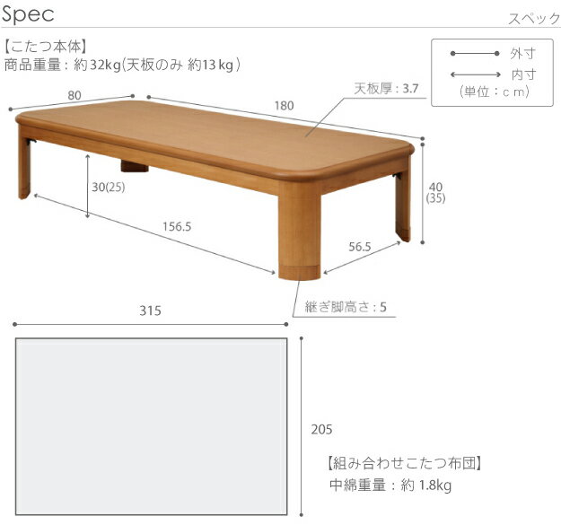 【セット構成】こたつ本体x1掛布団x1【カラーバリエーション】■こたつ本体ブラウン・ナチュラル■掛布団モリノキ・アツマリ・シラカバ・ケイランサス・サンフラワー・ダイリン【仕様】■こたつ本体天板:天然木化粧繊維板(楢柾目)脚部:天然木(ラバーウッド)フラットヒーター(300W、中間スイッチ式)◎一部組立(脚部)■掛布団表地:ポリエステル100%裏地:ポリエステル100%(ベロア)中綿:ポリエステル100%(中空綿)ウォッシャブル【サイズ】■こたつ本体幅180x奥行80x高さ約40cm重量:約32kg本体高さ:約35/40cm天板サイズ:幅180x奥行80cm・厚み37mm・約13kg脚間:156.5/56.5cm幕板下高さ:25/30cm■掛布団幅205x奥行315cm重量:約5kg中綿:約1.8kg株式会社ナカムラ(N11100416)【納期目安】メーカーより直送/翌営業日から5営業日出荷※メーカー在庫での対応となります。